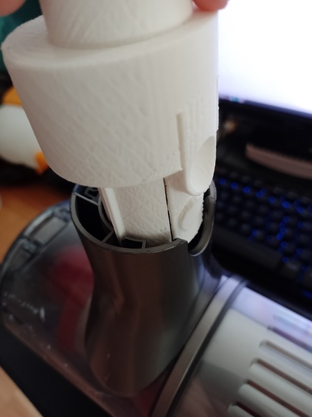 J'ai commencé par faire un adaptateur basique à base de deux simples connes dos-à-dos, et avec un simple trou en forme de cylindre. Ce système tien par force et fonctionne à peu près correctement, mais il glisse parfois, car il n'utilise pas l'accroche intégrée au bloc aspirateur :