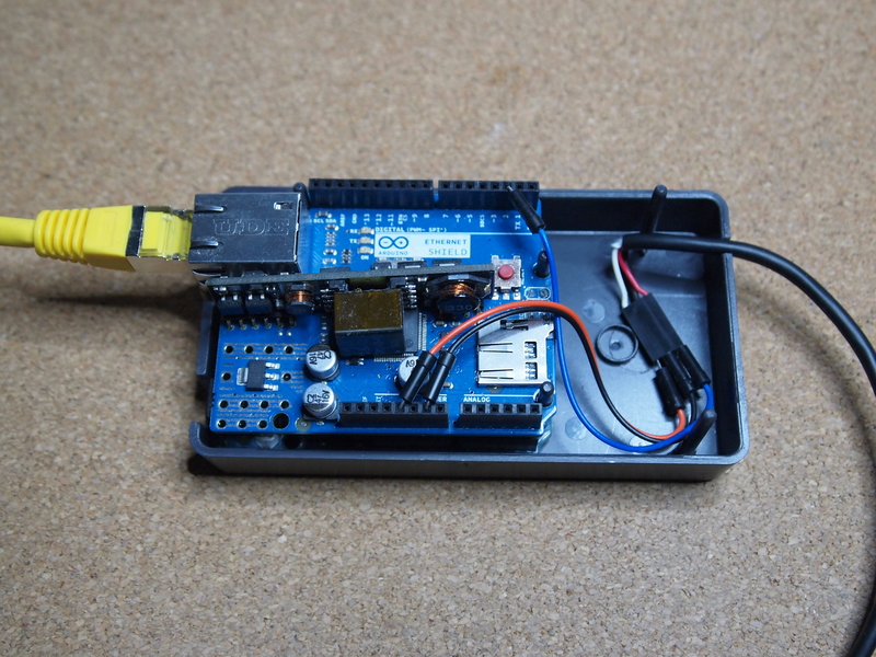 Cette version utilise le shield ethernet Arduino officiel sur lequel a été soudé l'option POE. Du coup l'ensemble carte Arduino et afficheur peuvent être alimenté directement par un switch ethernet POE. Dans mon cas, n'ayant pas switch POE sous la main, j'ai utilisé un injecteur POE.