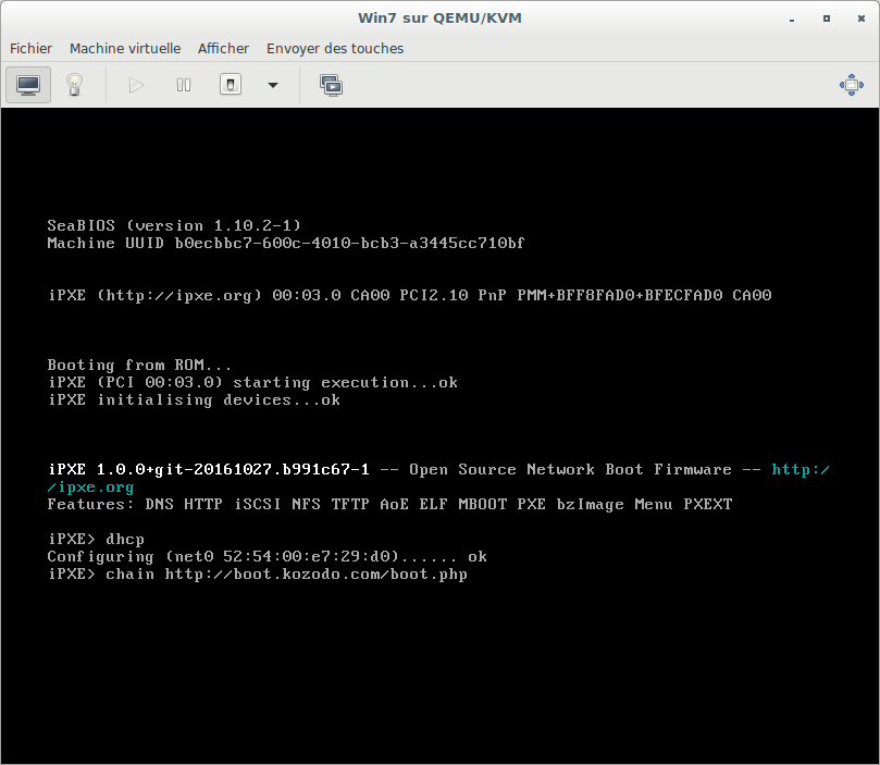 dhcpest en commentaire, car ce pool/non-free/f/firmware-nonfree/(firmware-.*.deb) phase a normalement été effectuée par le loader iPXE juste avant de charger ce script.Maintenant nous avons une séquence de chargement iPXE complète. Faisons un test avec une VM sous KVM (ou sous VirtualBox si vous l'avez installée).