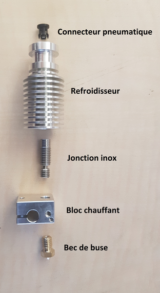 Après réchauffage dans une casserole pour faire fondre le reste de filament et un peu de curage j'en ai sorti les résidus. Mais cela n'a pas suffit car j'ai tordu le heat-breaker lors des manipulations; de plus le tour de la tête était devenu assez sale; j'ai donc finalement complètement remplacé la tête par un modèle acheté dans mon magasin 3D préféré LetMeKnow en suivant le mode d'emploi de CREALITY. En revanche j'ai gardé le radiateur d'origine car son connecteur pneumatique laisse passer le filament jusqu'au heat-breaker contrairement au nouveau.